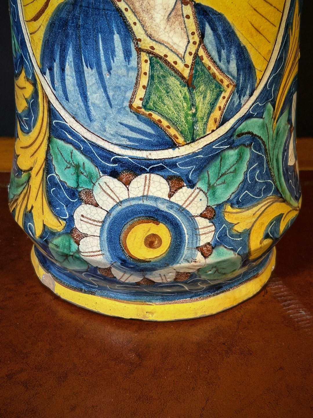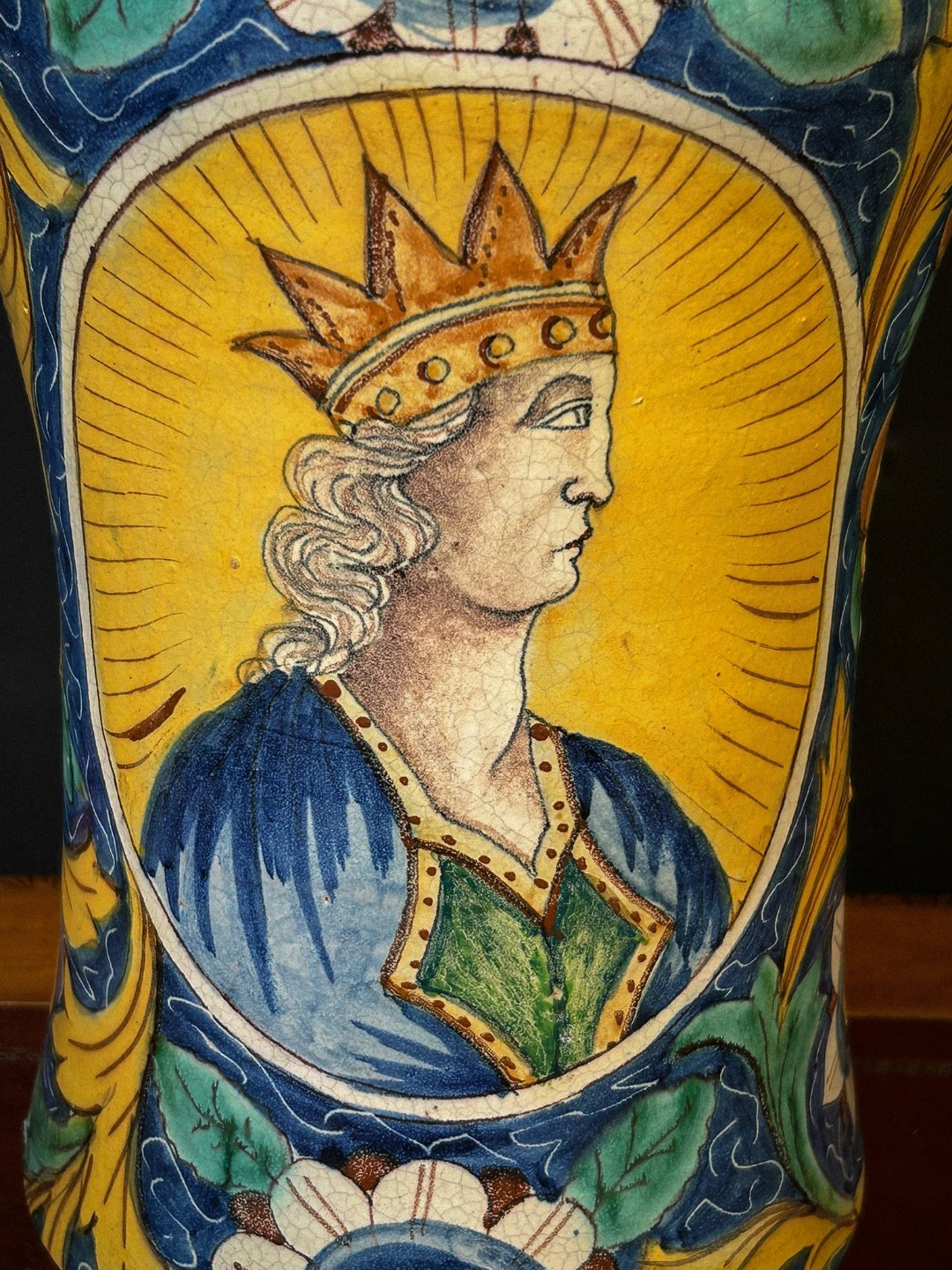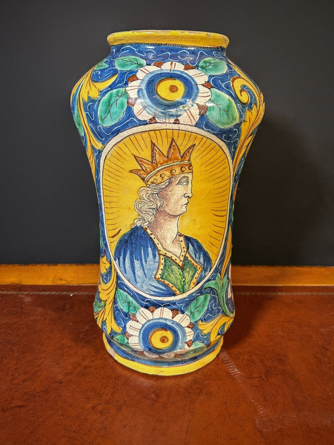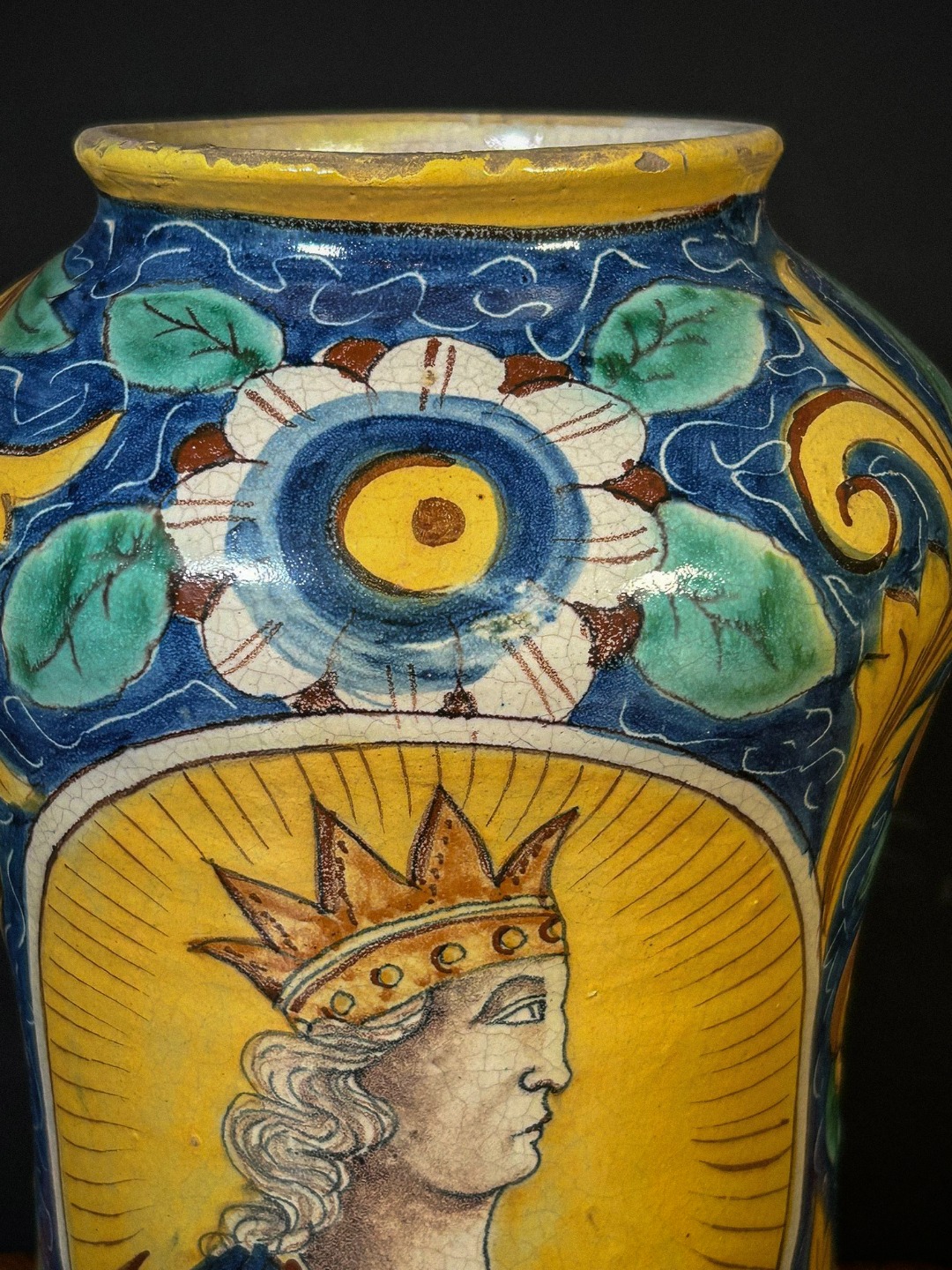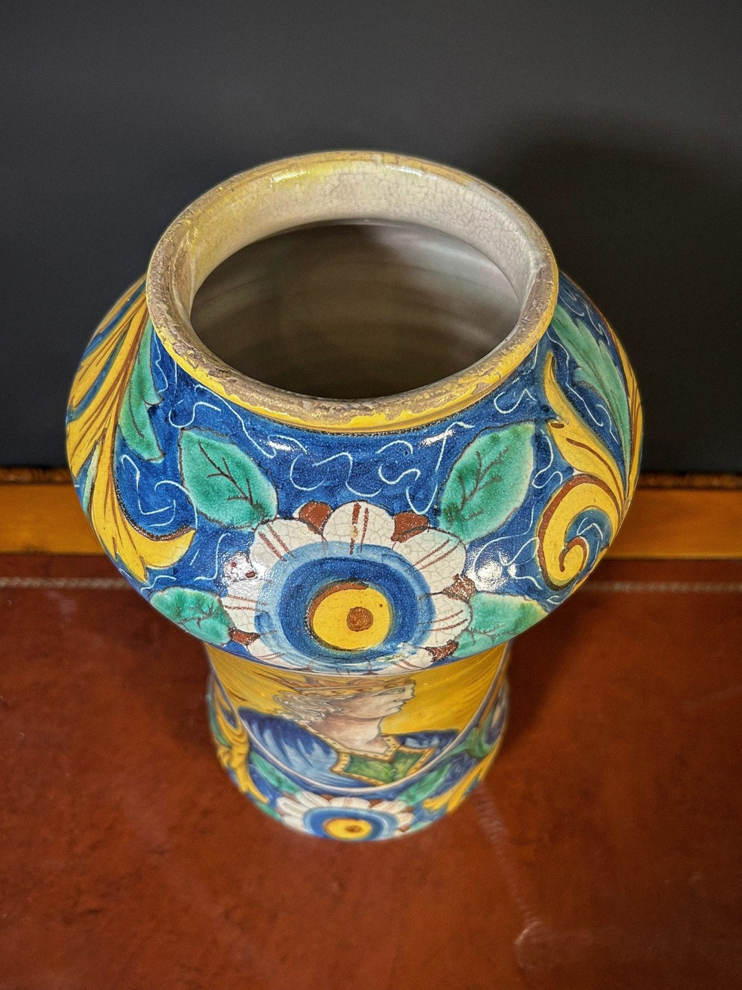Importante vaso da farmacia in maiolica dipinta, caratterizzato da una decorazione policroma estremamente vivace e ricca. Su due lati opposti presenta grandi medaglioni con ritratti maschili stilizzati, uno coronato e l’altro con copricapo rinascimentale, entrambi immersi in un fondale giallo raggiato che ne esalta la presenza scenica.