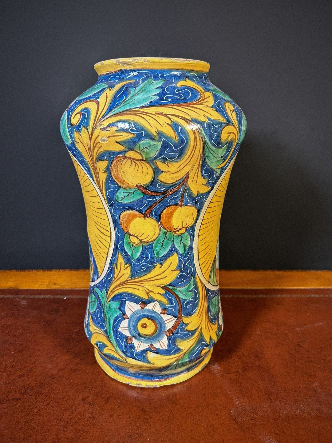Il corpo del vaso è ornato da motivi floreali e fitomorfi eseguiti con pennellate decise e colori intensi quali blu, verde, giallo e aranciato. La pittura conserva la tipica craquelure della maiolica smaltata, con piccole usure e leggere sbeccature sul bordo coerenti con l’età e la lavorazione artigianale.