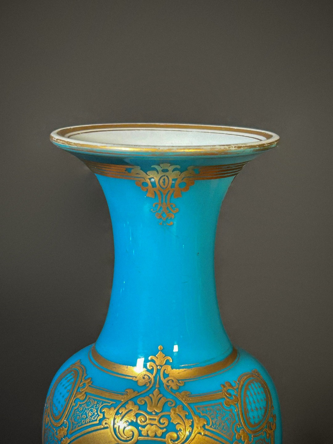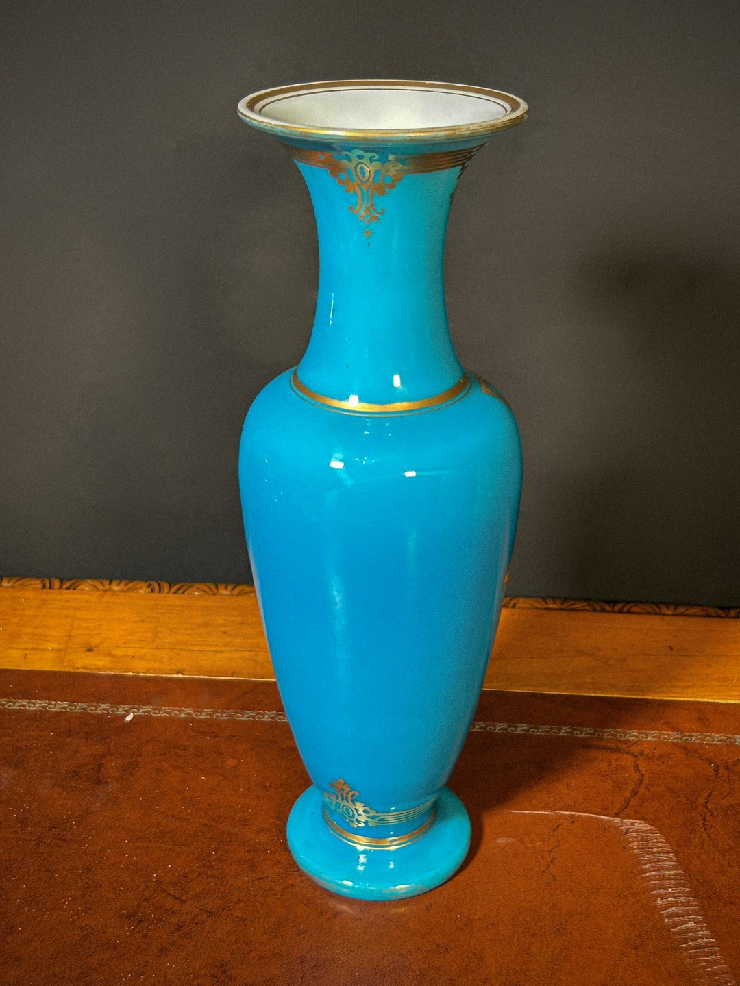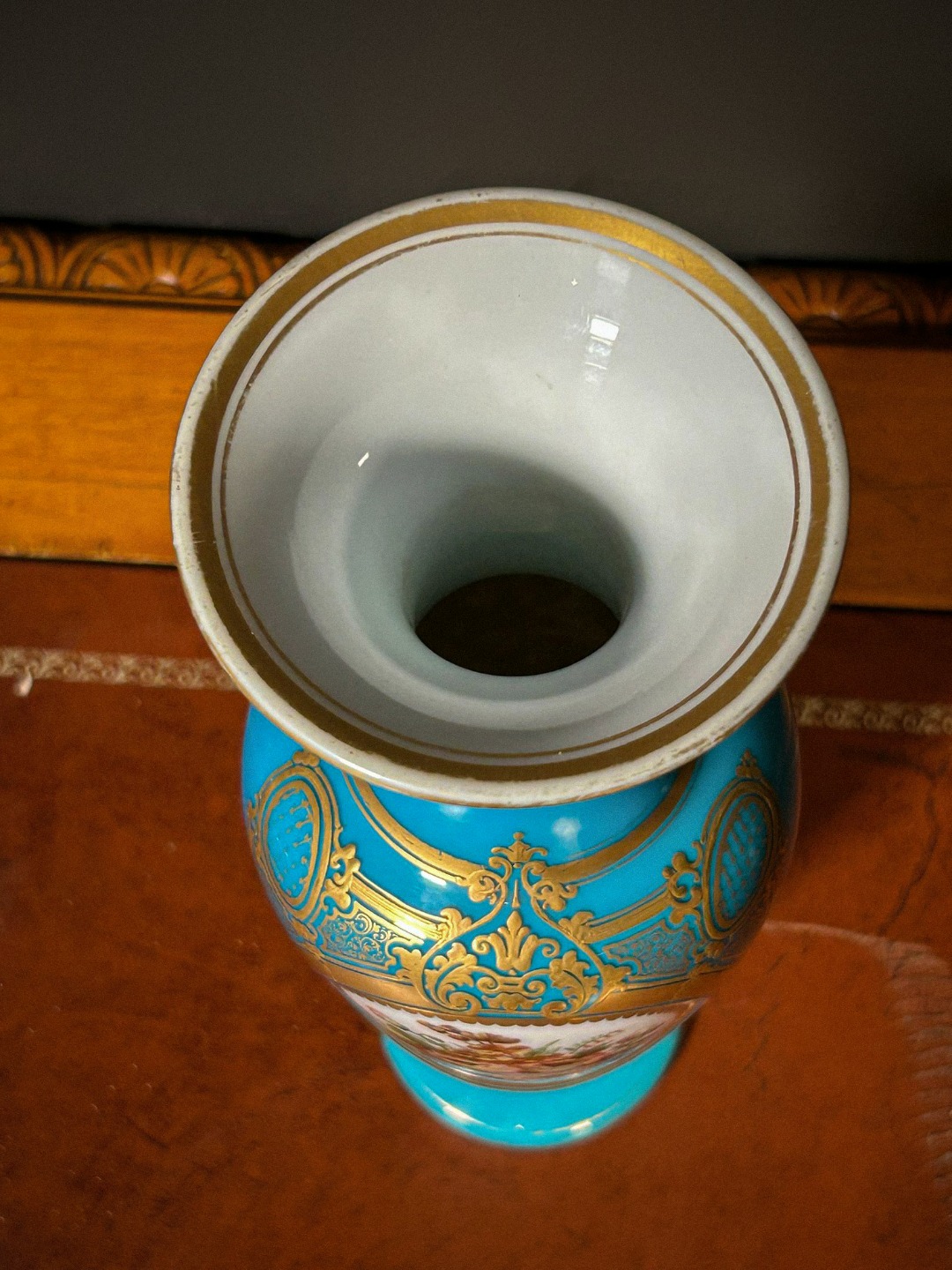 Il retro del vaso mantiene la stessa smaltatura turchese uniforme, con dettagli dorati che ne valorizzano la forma. La bocca interna è smaltata in bianco con doppio bordo dorato, mentre la base non presenta marchi visibili, tipico di molte produzioni artistiche italiane e francesi del periodo.