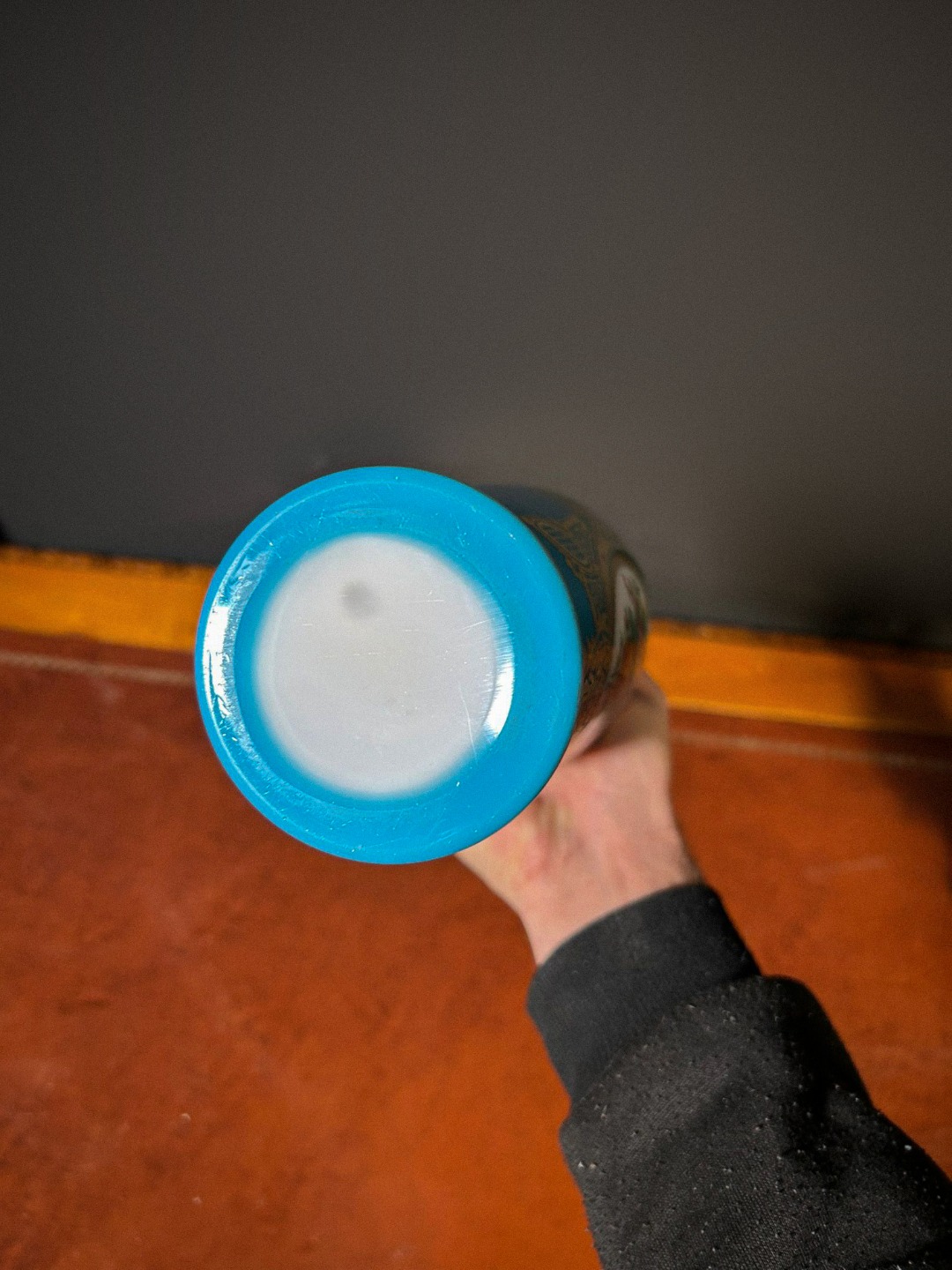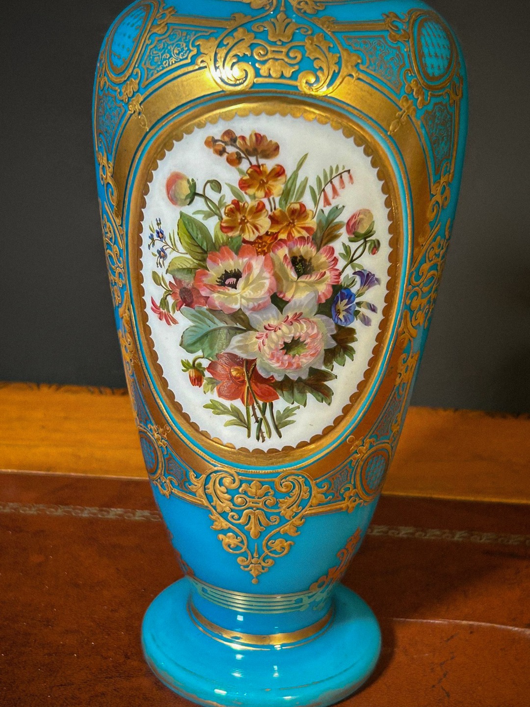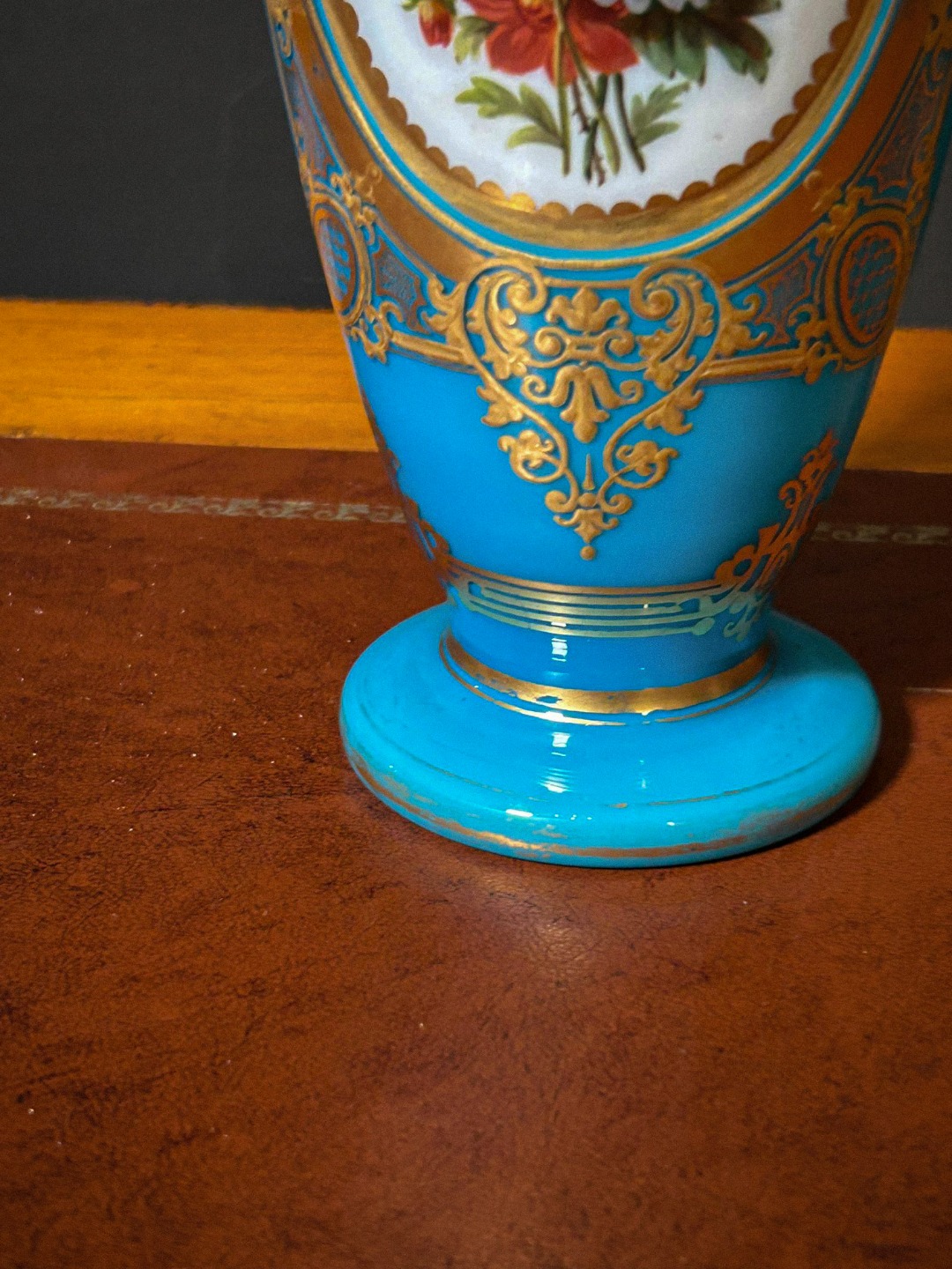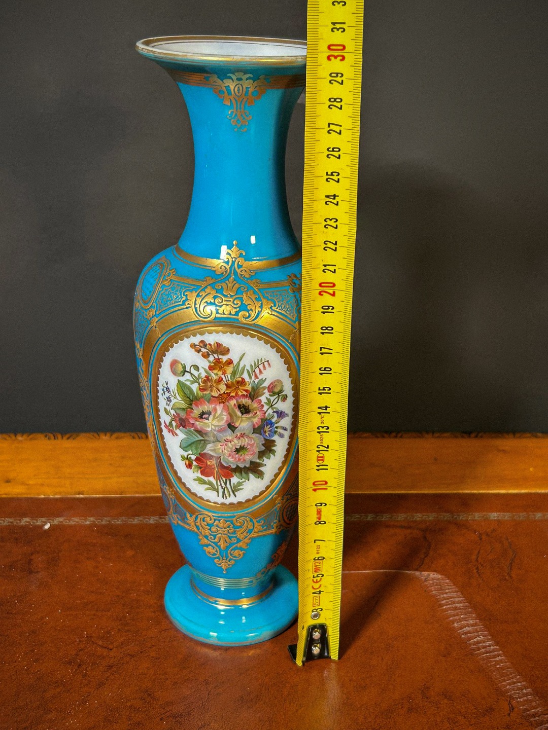 Il retro del vaso mantiene la stessa smaltatura turchese uniforme, con dettagli dorati che ne valorizzano la forma. La bocca interna è smaltata in bianco con doppio bordo dorato, mentre la base non presenta marchi visibili, tipico di molte produzioni artistiche italiane e francesi del periodo.