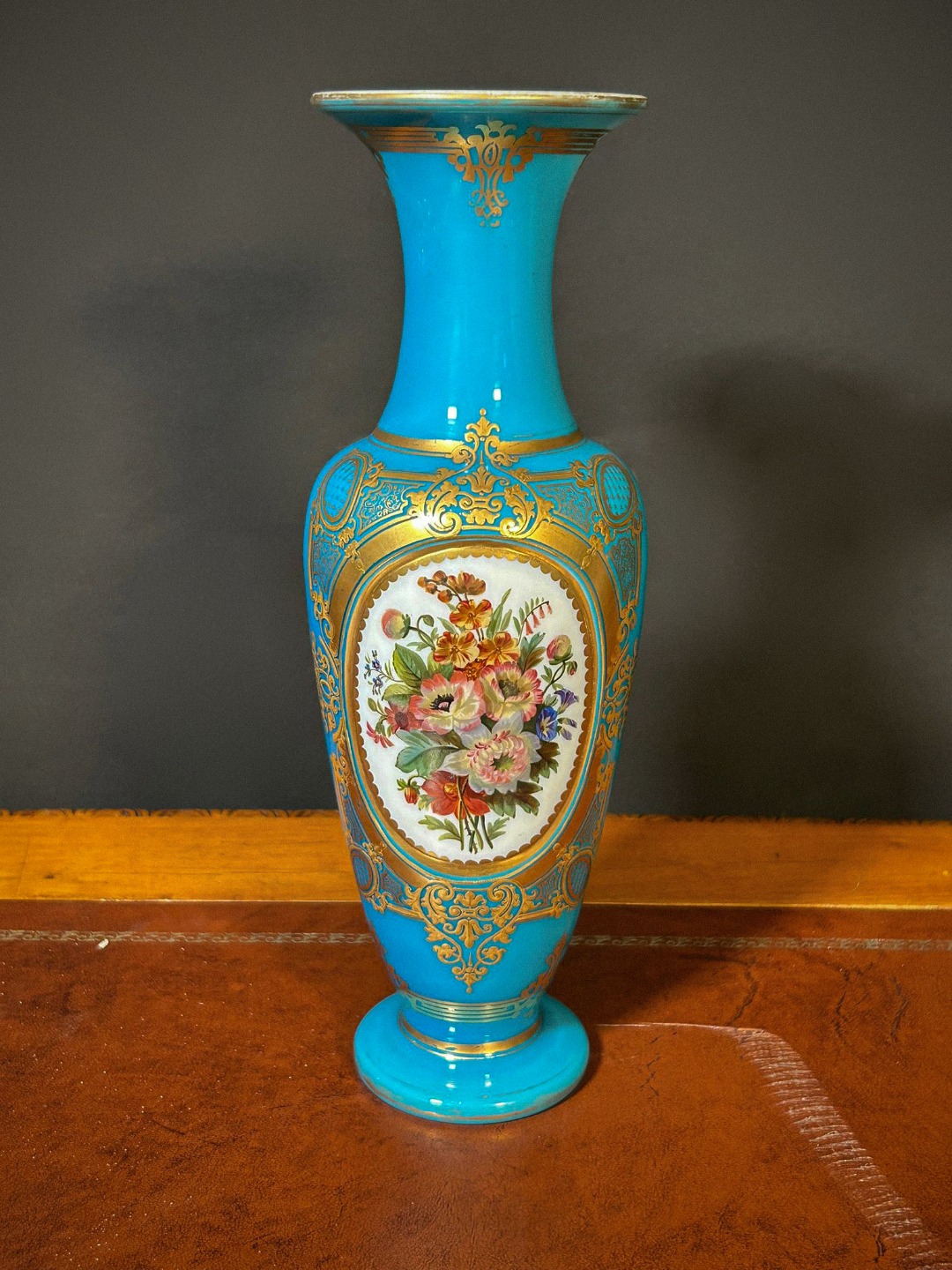Elegante vaso in porcellana caratterizzato da una vivace smaltatura turchese e da una ricca decorazione dorata applicata a mano. La forma slanciata, con corpo affusolato e bocca svasata, conferisce al pezzo un’eleganza verticale che richiama le produzioni decorative di inizio Novecento.