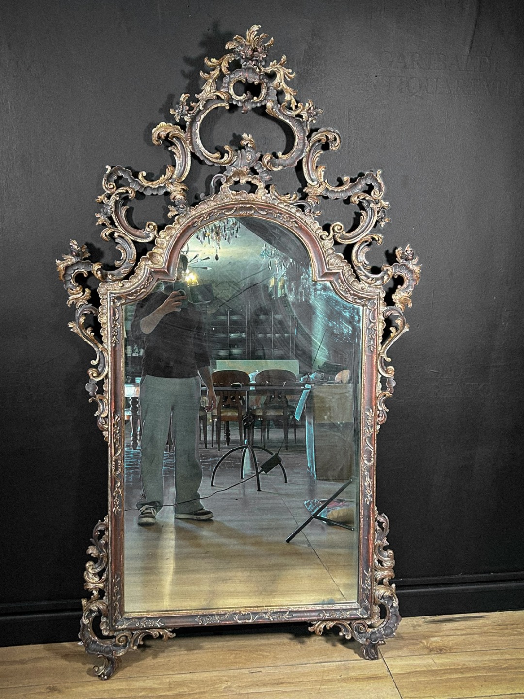 Lo specchio originale al mercurio mostra le naturali ossidazioni e velature del tempo, dettaglio che ne attesta l’autenticità e il fascino antico. Anche i piedi inferiori sono riccamente intagliati e raccordati alla struttura con armonia e continuità decorativa.