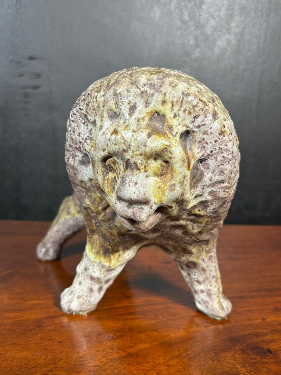 Particolare statuetta in ceramica raffigurante un leone stilizzato in posizione eretta, caratterizzato da forme compatte e proporzioni robuste. La figura presenta una lavorazione materica con superficie ricca di texture e smaltatura policroma nei toni del marrone, ocra e verde, che conferisce profondità e movimento all’insieme.