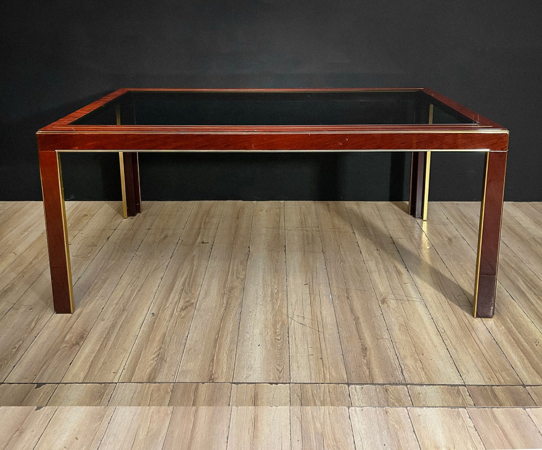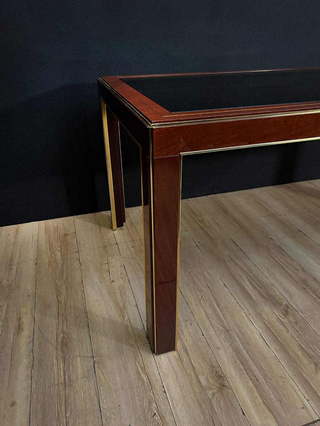 Realizzato in Francia, il tavolo presenta un’audace finitura bordeaux che si combina splendidamente con il piano in vetro cristallo Fumé trasparente.