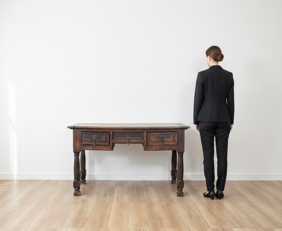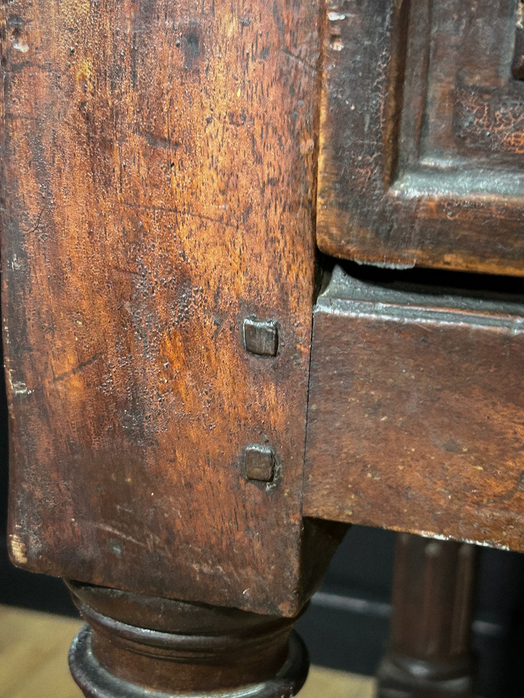 La base poggia su robuste gambe tornite, raccordate inferiormente da traverse di rinforzo, che conferiscono stabilità e solidità all’intera struttura. Le proporzioni equilibrate, unite alla sobrietà delle linee e alla qualità del noce antico, rendono questo arredo ideale per studi, biblioteche o ambienti di rappresentanza di gusto classico.