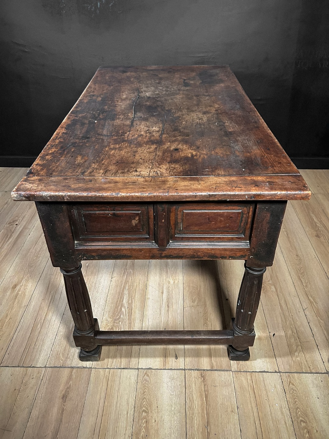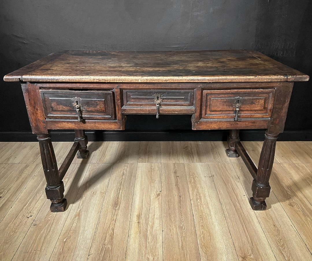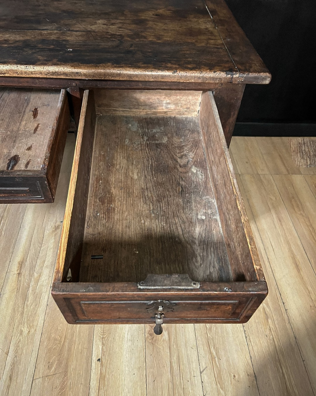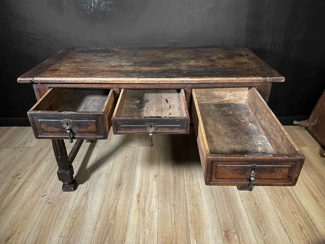 Importante scrivania italiana di epoca Settecento realizzata interamente in legno di noce massello, caratterizzata da una struttura solida e proporzionata, tipica della produzione artigianale del periodo. Il piano rettangolare presenta una patina antica omogenea, con segni del tempo coerenti con l’età del mobile, che ne testimoniano l’autenticità e l’uso storico.