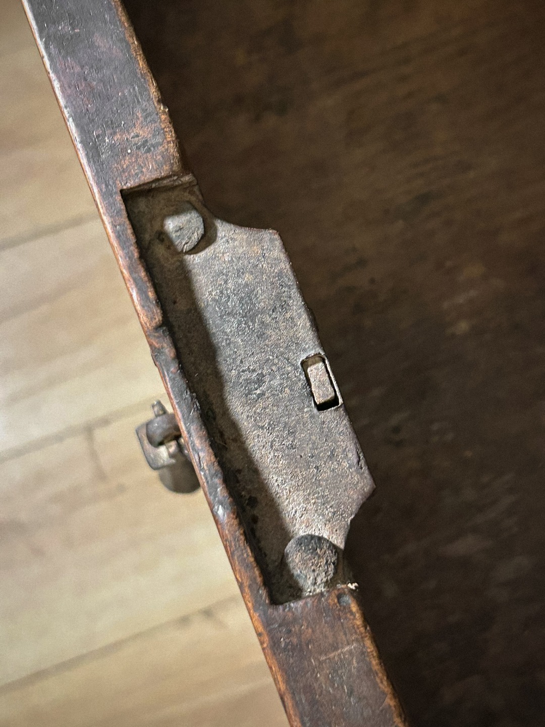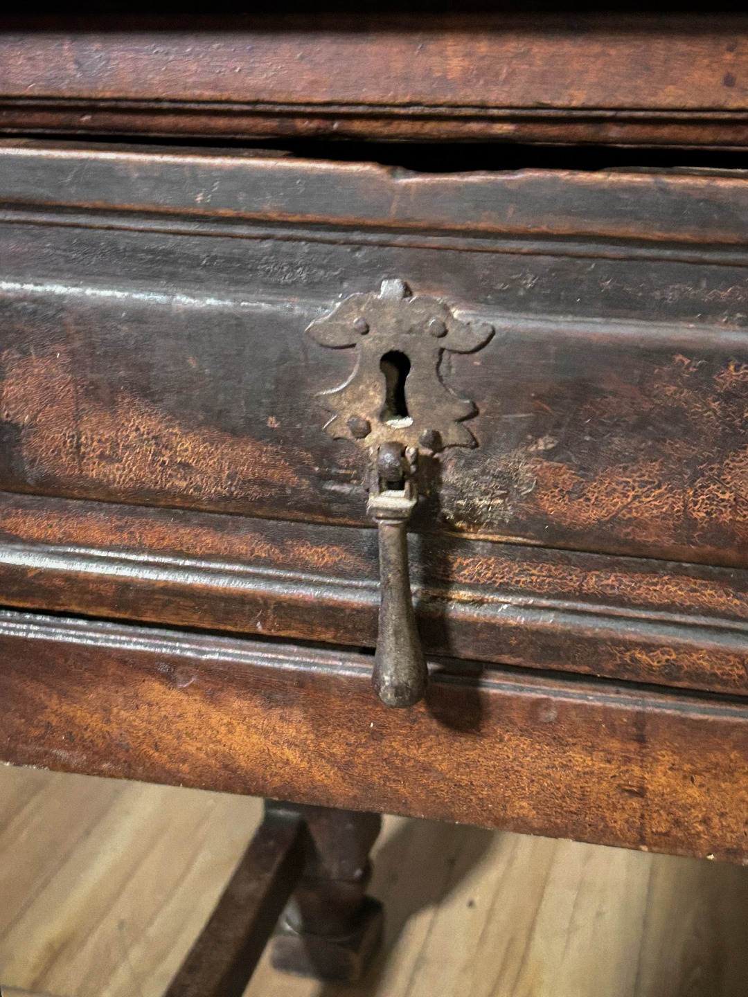La fascia frontale è organizzata con tre cassetti allineati, ciascuno dotato di serrature e maniglie originali in ferro, finemente sagomate. La disposizione dei cassetti, con quello centrale arretrato, consente una comoda seduta. La scrivania è lavorata anche sul retro con finti cassetti, permettendo una collocazione a centro stanza.