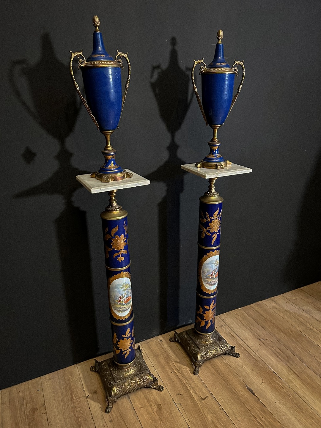 Raffinata coppia di colonne con vasi della prestigiosa manifattura Sevres, risalenti al tardo XIX secolo e inizio XX secolo, provenienti dalla Francia.