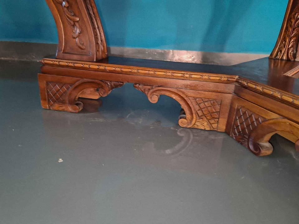 La fascia sottopiano è arricchita da una lavorazione decorativa continua, mentre la struttura poggia su sostegni sagomati e solidi, coerenti con lo stile dell’epoca e pensati per garantire stabilità e presenza scenografica.
