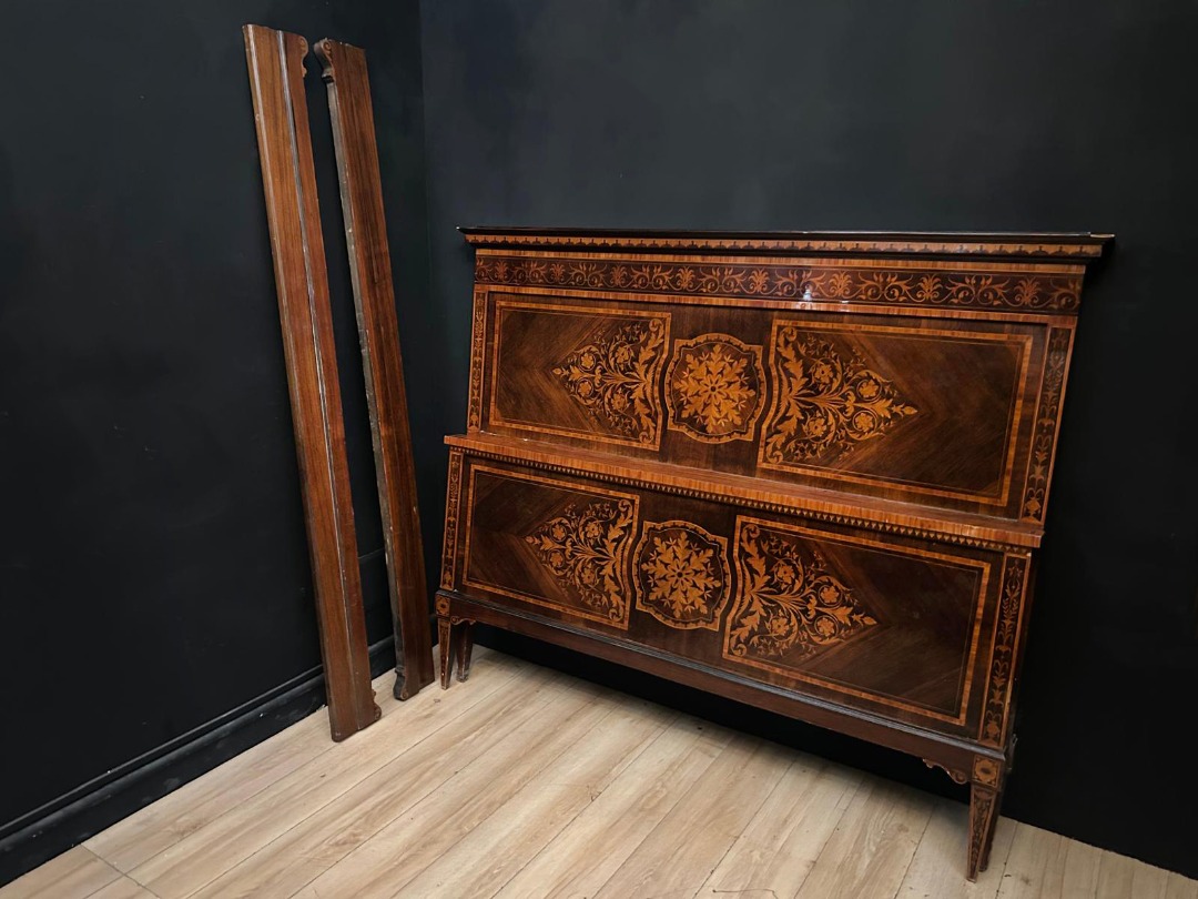 Antico Letto in stile Luigi XVI è un esemplare di artigianato del ‘900, con intarsi minuziosamente realizzati in acero su base di legno di noce.